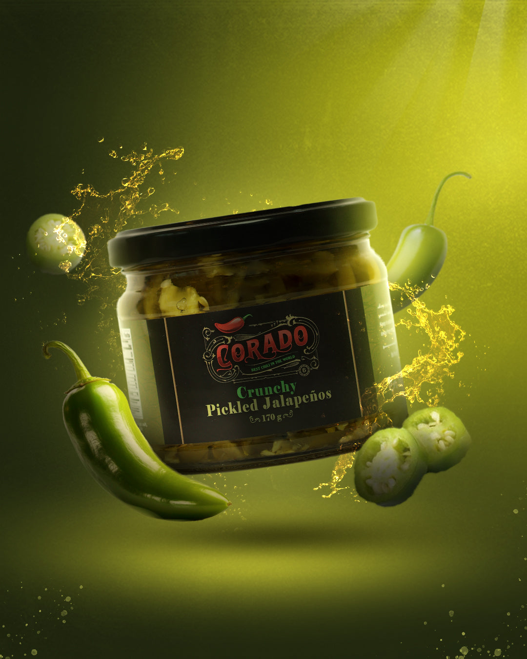Crunchy jalapeno Pickles, available in 170g jars and in catering size.